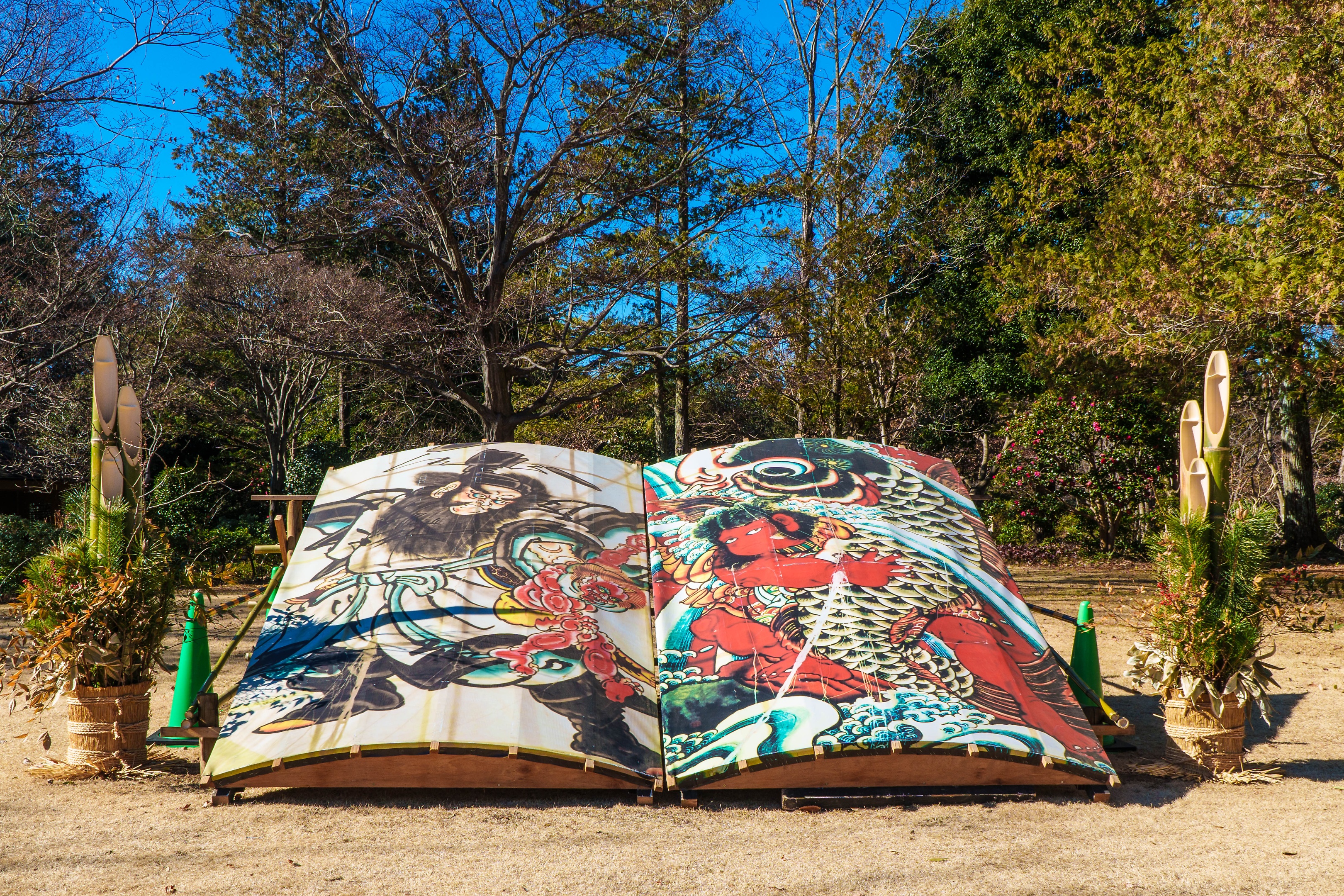 日本庭園で門松と大きな凧が飾られていました。