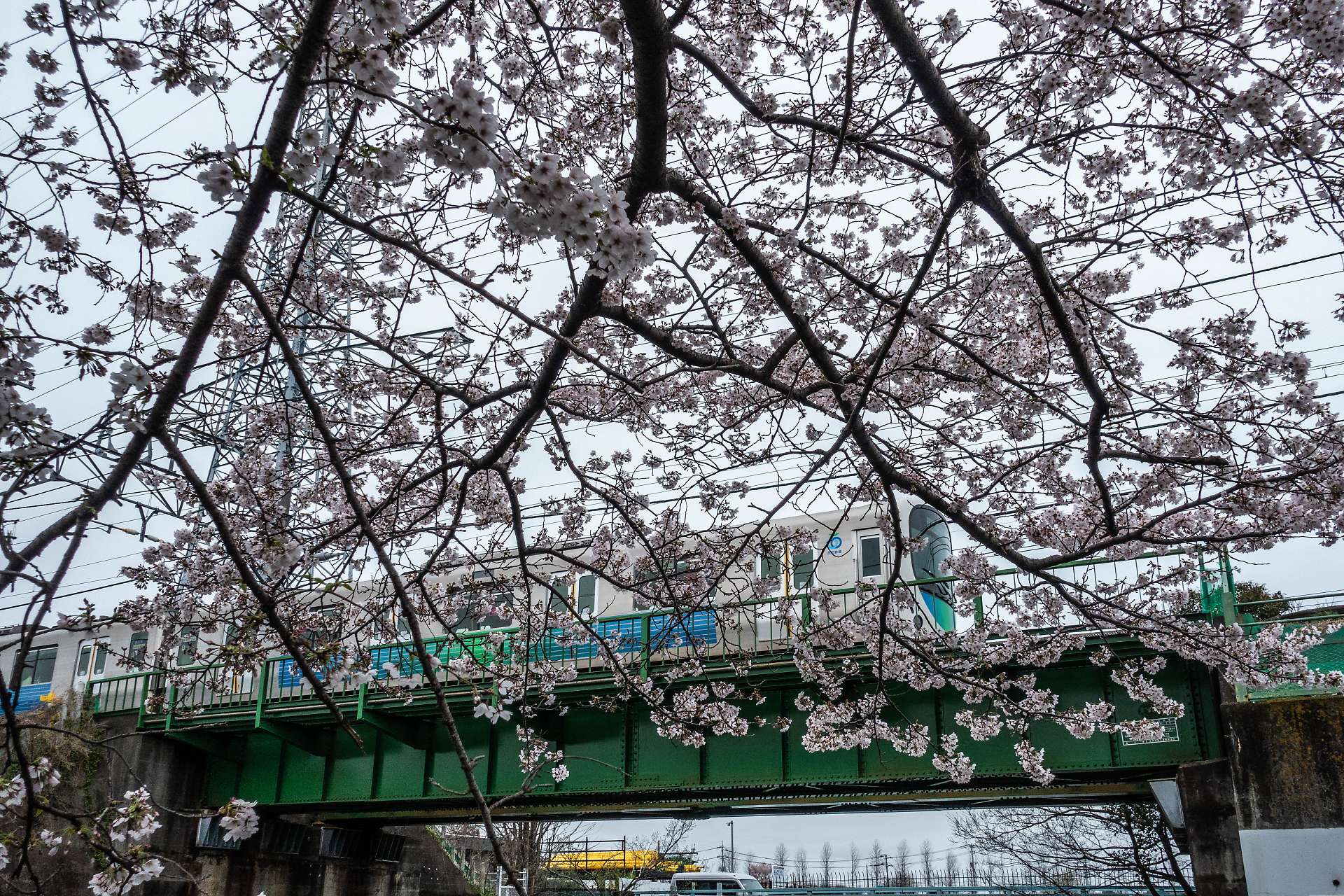 桜が満開の残堀川を渡る中央線。